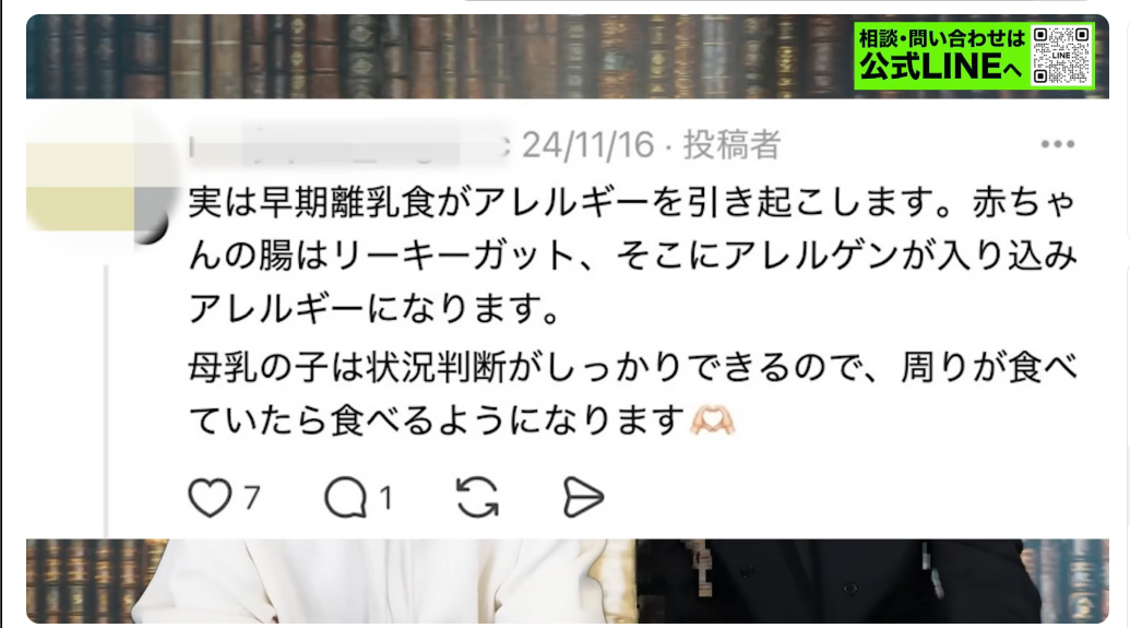 『実は早期離乳食がアレルギーを引き起こします。赤ちゃんの腸はリーキーガット。そこにアレルゲンが入り込みアレルギーになります。母乳の子は状況判断がしっかりできるので、周りが食べていたら食べるようになります』