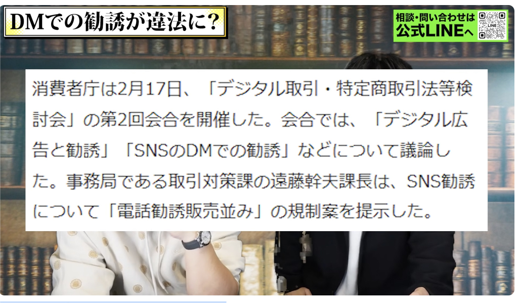ニュース等でも報道されていますが、消費者庁が開催した「デジタル空間における特定商取引のあり方等に関する検討会」において、デジタル広告やSNSのDMを使った勧誘手法について議論が行われました。