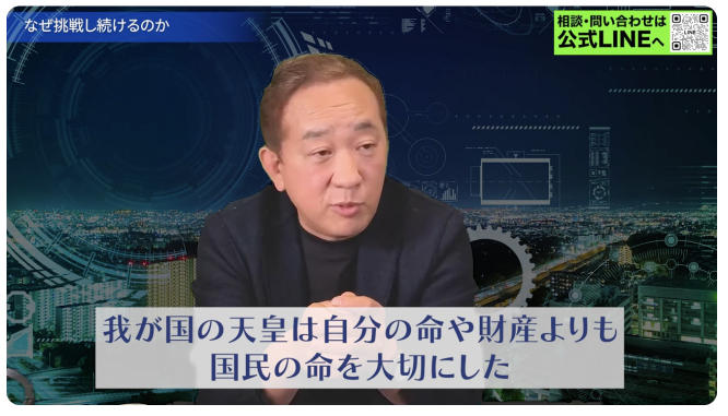 これが神の系譜。私たち日本の民族の血に脈々と流れてる思いなんです。この思いを分かって、そんなこと(詐欺など)ができますか?