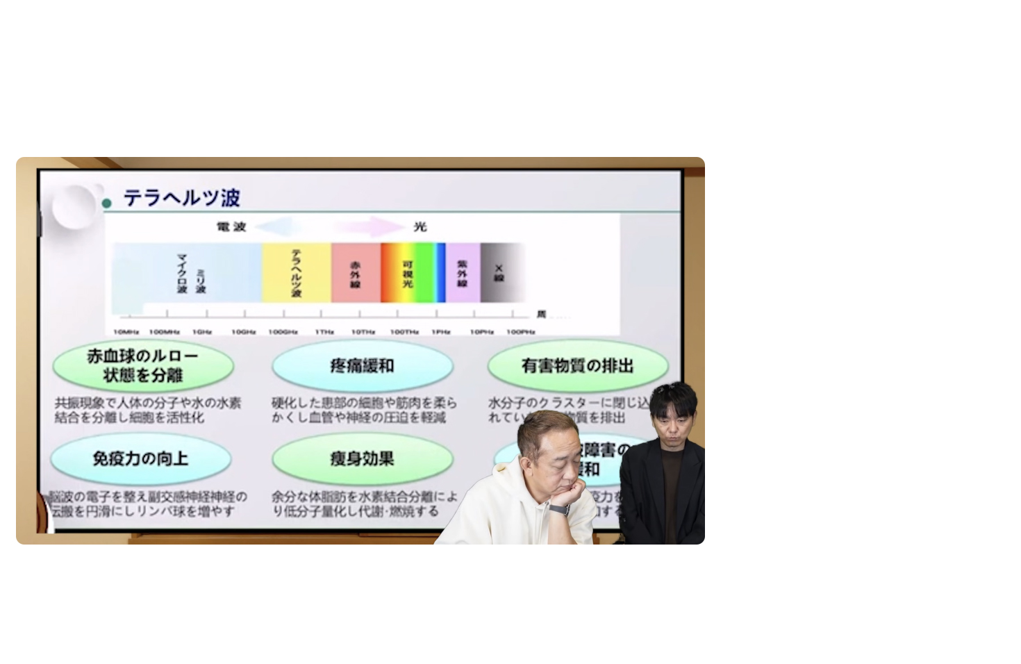 動画の続きで「残り10%をテラヘルツ波というもので補っている」と言ってますが、テラヘルツ波に関しましては、勉強すれば勉強するほど「これはヤバいやつだ」って分かるはずです。勉強してない人しか騙されないと思います。