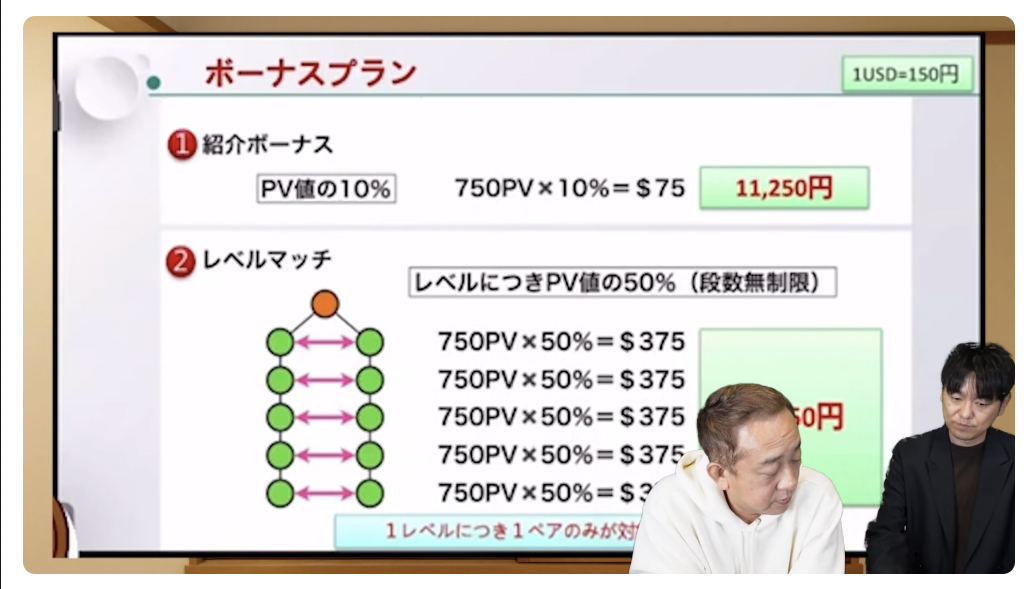 「レベルマッチボーナス…左に1台、右に1台売れてペアができた段階で約5万6000円…1段ごとにワンペアのみ」