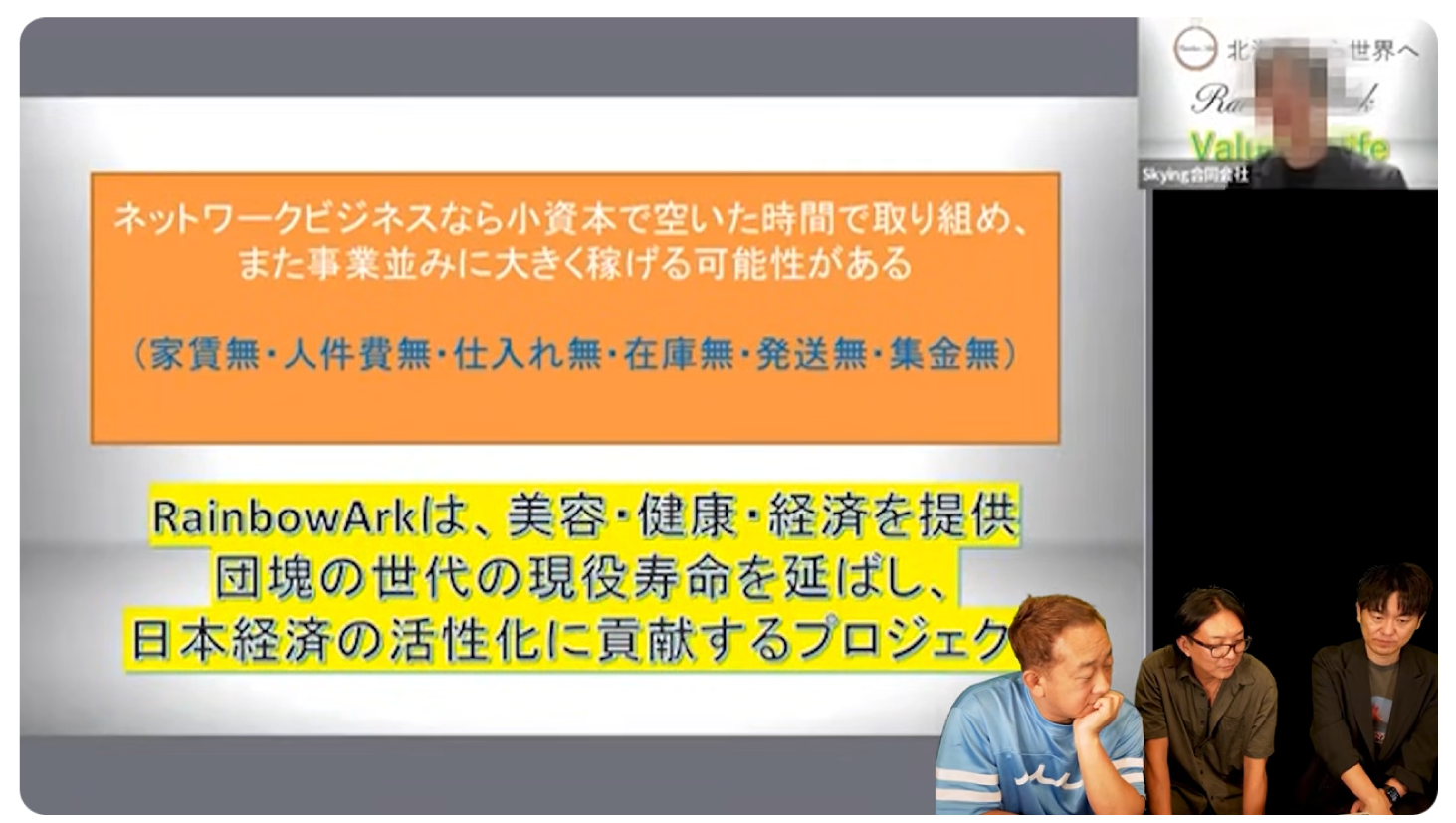 視聴者の方から頂いたこの動画、結構な新興企業、いわゆる「新興ネットワークビジネス」なんですが、内容があまりにも「これ大丈夫なの?」というものばかり。法律に触れる部分、説明会の内容の矛盾点、ここにフォーカスを当てていきます。