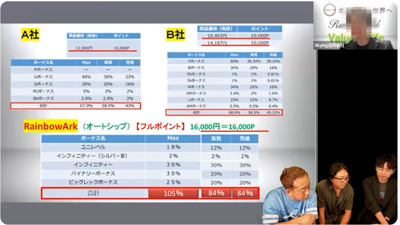 - ビジネスモデルの欺瞞:「還元率105%」など、数学的にあり得ない数字で勧誘している。