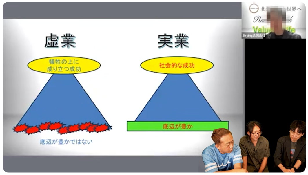 「今、どうもマネーゲームに偏っているケースが多いんですよね。商品が良いか悪いかよりも『人を集めたら儲かるよ』みたいな。(中略)これは『虚業』になってしまっているんですね。虚業は底辺が豊かじゃないんです。(中略)でも実業というのは違いますよね。底辺が豊かです。」