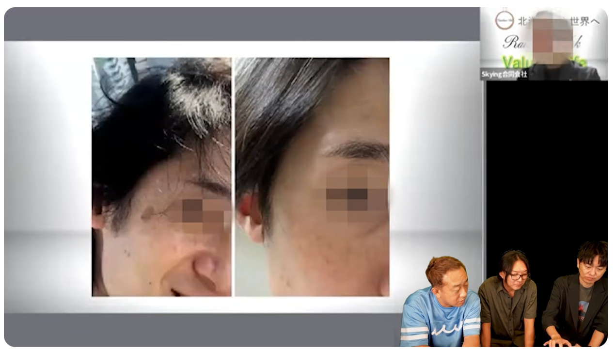 「これ私のビフォーアフターの写真ですね。顔の側面に大きなシミがあったんですけど、きれいに消えました。(中略)あのゲルを塗ってるだけでシミが消えていったという。(中略)周りからも『若返った』って言われるんです。」